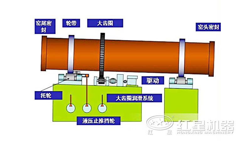 白灰回轉(zhuǎn)窯在工作過程中,白灰從窯尾筒體高端的下料管喂入窯筒體內(nèi),由于窯筒體的傾斜和緩緩地回轉(zhuǎn),使白灰產(chǎn)生一個即沿著圓周方向翻滾,又沿著軸向從高溫向低端移動的復(fù)合運(yùn)動,白灰在窯內(nèi)通過分解,燒成等工藝過程,燒成熟料后從窯筒體的底端卸出。
