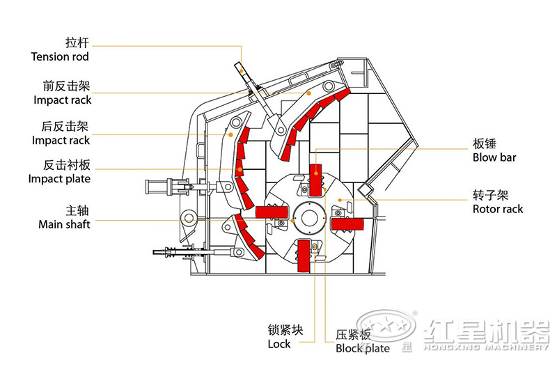 破碎的力來自兩方面,一方面是物料間的互相碰擊產(chǎn)生的作用力。另一方面,物料受到板錘的打擊、與反擊板的沖擊產(chǎn)生的力,這些力共同作用物料,使物料不斷產(chǎn)生裂縫,松散而致粉碎。當(dāng)物料粒度小于反擊板與板錘之間的縫隙時,就被卸出。調(diào)整反擊架與轉(zhuǎn)子之間的間隙可達到改變物料出料粒度和物料形狀的目的。