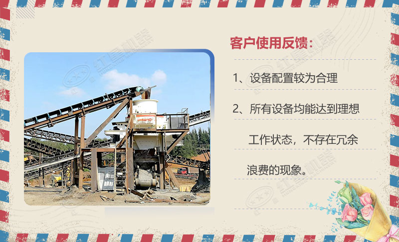 整條制沙生產(chǎn)線設(shè)備配置較為合理,所有設(shè)備均能達(dá)到理想工作狀態(tài),不存在冗余浪費(fèi)的現(xiàn)象,且產(chǎn)出的沙石成品也都不錯(可以賣上好價錢),僅投產(chǎn)半年已處于盈利狀態(tài),客戶表示很滿意!