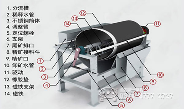 當(dāng)?shù)V物顆粒和脈石顆粒通過鉀長石除鐵磁選機(jī)磁場時(shí),由于礦粒的磁性不同,在磁場的作用下,它們運(yùn)動的方式不同。磁性礦粒受磁力的吸引,附著在除鐵機(jī)的圓筒上,被圓筒帶到一定的高度后,脫離磁場從筒上利用高壓沖洗水沖落。非磁性顆粒(脈石顆粒)在除鐵機(jī)磁場中不受磁力的吸引,因而不能附著在圓筒上。除鐵機(jī)得到兩種產(chǎn)品,一種是磁性產(chǎn)品進(jìn)人尾礦箱,另一種是非磁性產(chǎn)品進(jìn)人精礦箱,這樣就可以對鉀長石進(jìn)行提純。
